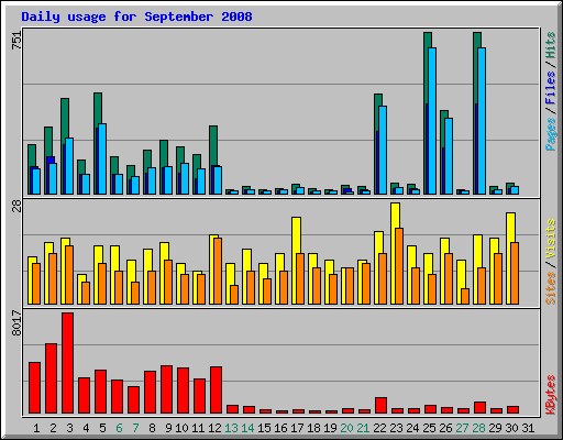 | Day | Hits | Files | Pages | Visits | Sites | KBytes | ||||||